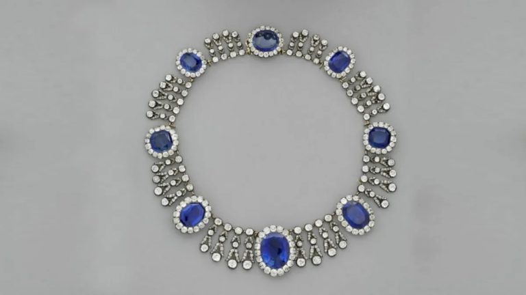 A peça em questão é um colar de safiras e diamantes que pertenceu à rainha Maria Amélia da França, esposa do rei Luís Filipe I.