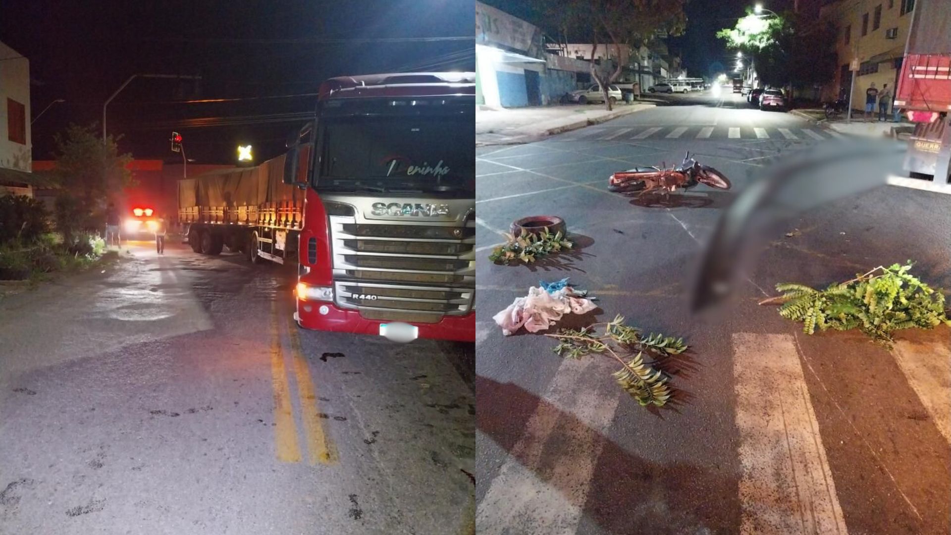A mulher pilotava uma Honda Biz quando colidiu com o caminhão, que estava fazendo uma conversão no semáforo.