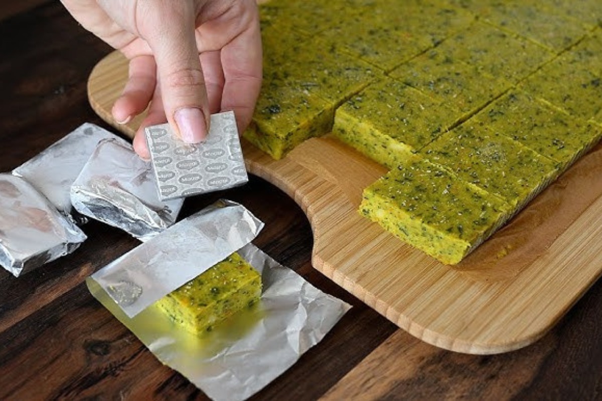 O caldo pronto deve ser espalhado em uma assadeira forrada com papel manteiga e levado ao freezer por pelo menos 8 horas. Depois de congelado, basta cortar em cubinhos e armazenar em recipientes ou sacos próprios para congelamento.