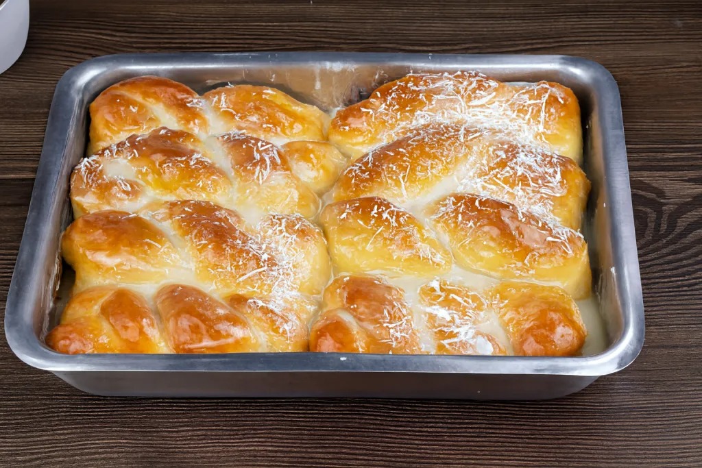 Por fim, leve a rosca ao forno preaquecido a 200 °C e asse até que fique levemente dourada. Assim que retirar do forno, finalize com leite condensado por cima. Além disso, se desejar, polvilhe coco ralado para dar um toque especial.