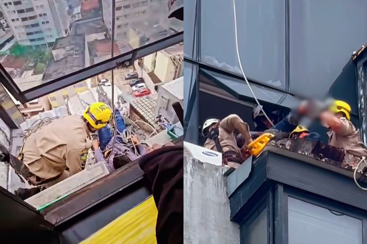 Ele só parou ao atingir um telhado de zinco do 9º andar, em uma área estendida do prédio. Ao chegar ao local, os bombeiros notaram que o trabalhador estava consciente e falando, mas com uma fratura exposta no tornozelo direito.