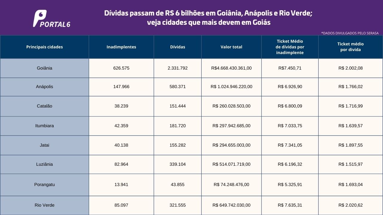 A maioria esmagadora está na capital do estado. Os dados do Serasa mostram que Goiânia soma atualmente 626 mil devedores, com média de R$ 7.450,71 em dívidas. O montante total de dívidas chega a R$ 4.668 bilhões na cidade.
