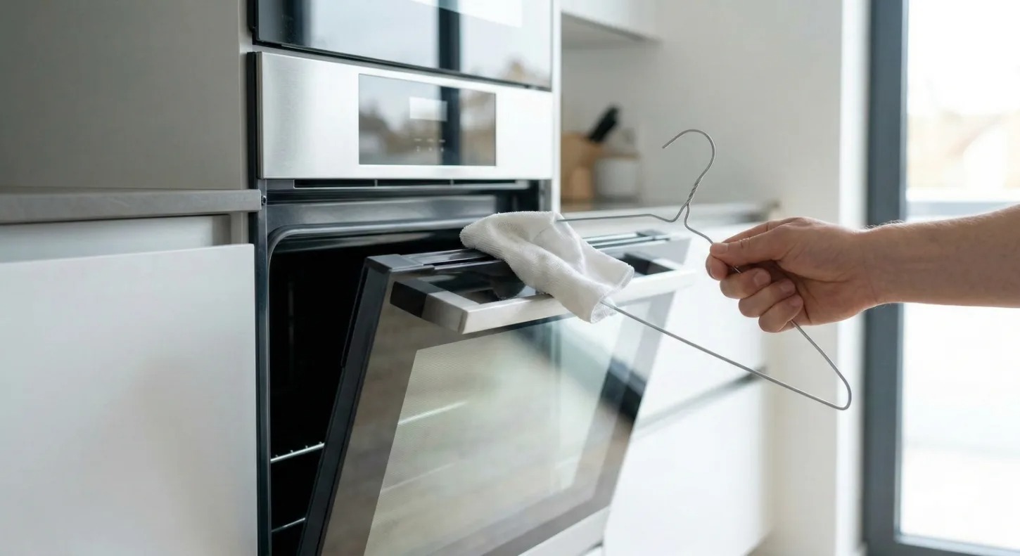 O método do cabide com toalha mostra que nem sempre é preciso desmontar o forno ou investir em desengordurantes potentes.