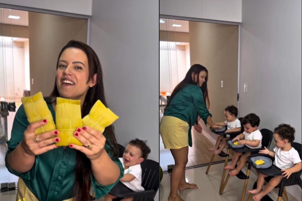 Segundo a mãe, os trigêmeos começaram a experimentar novos alimentos ainda bebês, mas foi recentemente que provaram pamonha pela primeira vez — e a reação surpreendeu.