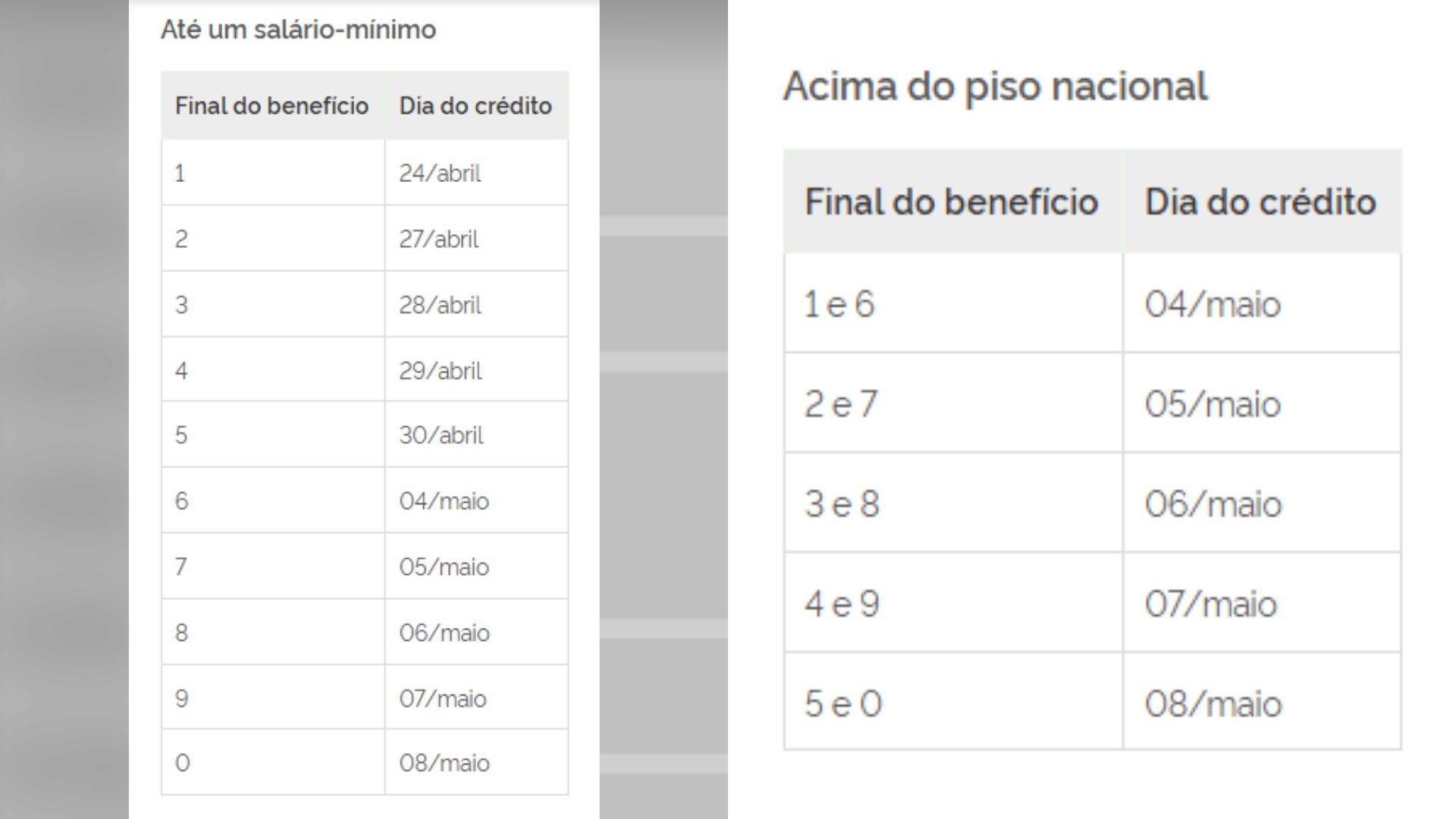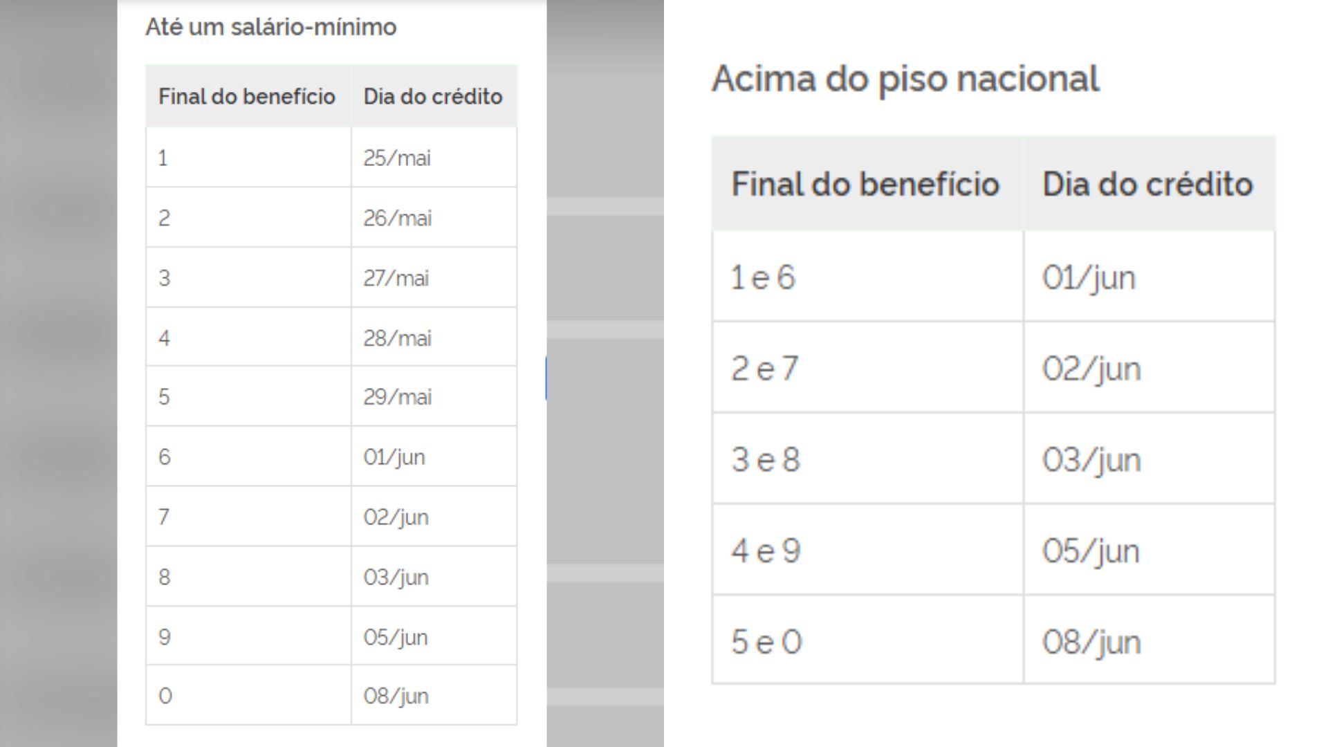 O da segunda começa em 25 de maio e segue até o dia 08 de junho. A data leva em conta o número final do cartão de benefício, sem considerar o último dígito verificador, que aparece depois do traço.