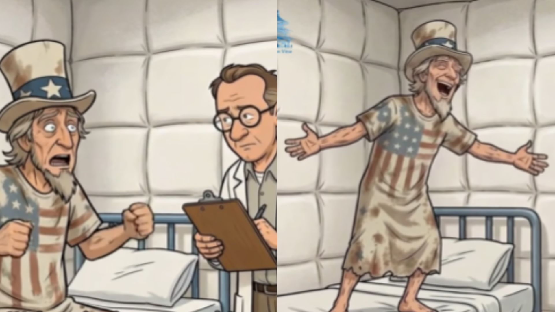 Em outra publicação, o Tio Sam aparece em uma espécie de hospício com as vestes sujas e desgastadas no momento de ser avaliado por um médico e uma enfermeira. Quando o profissional de saúde pergunta como ele está se sentindo, o personagem começa a gritar.