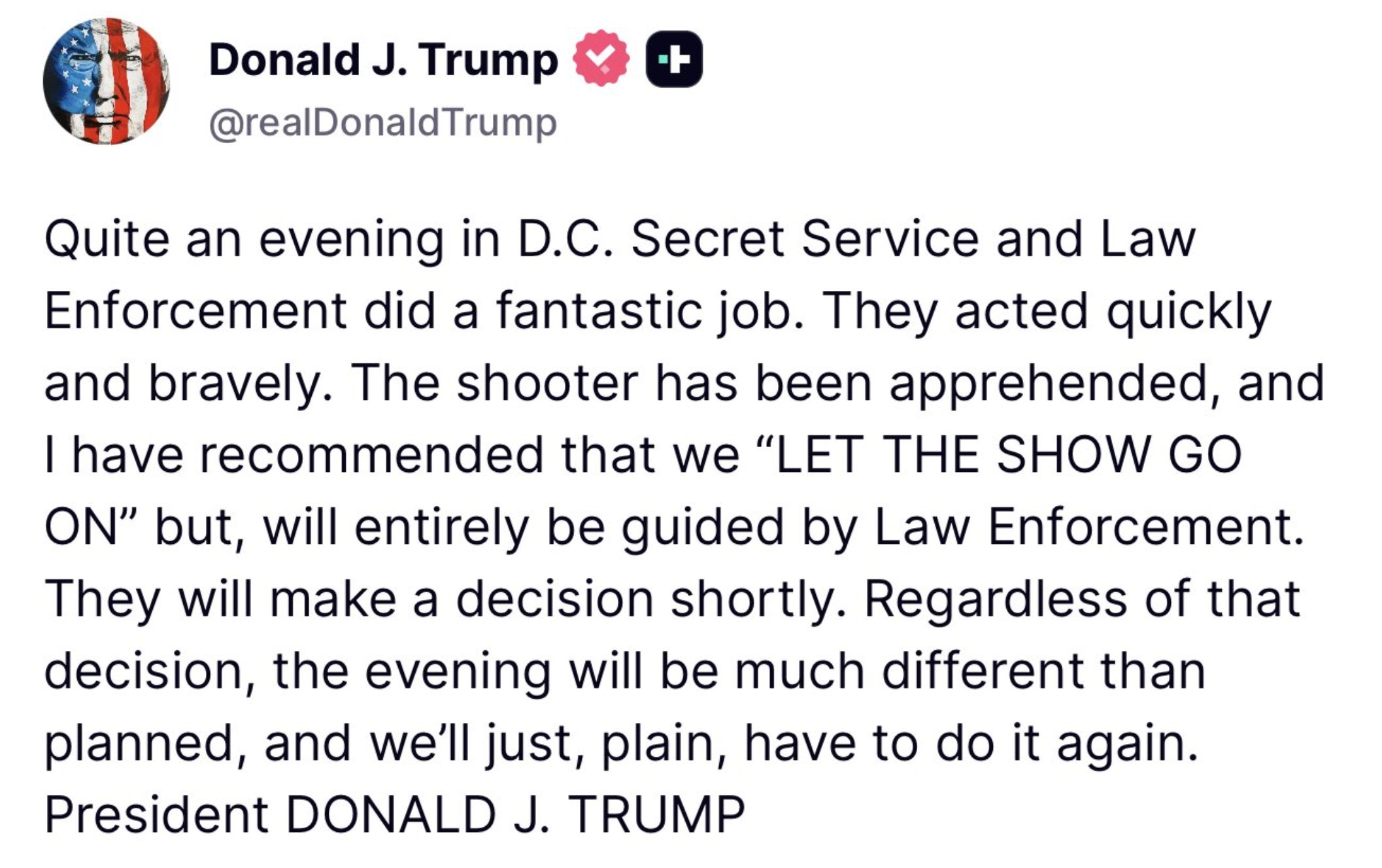 A declaração foi feita nas redes sociais logo após o incidente, registrado na noite deste sábado (25), em Washington.