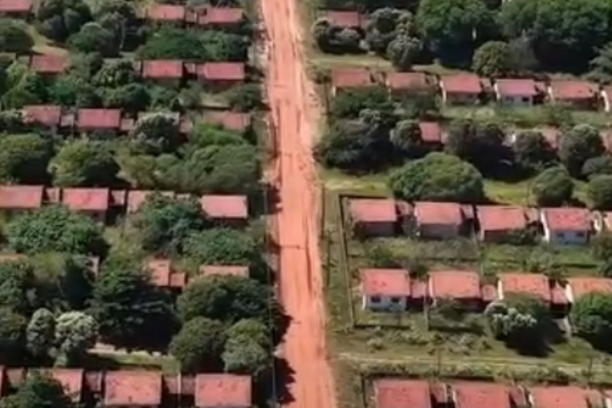 As imagens aéreas deixam tudo ainda mais impactante. Do alto, aparecem ruas inteiras tomadas por casas idênticas, todas vazias.