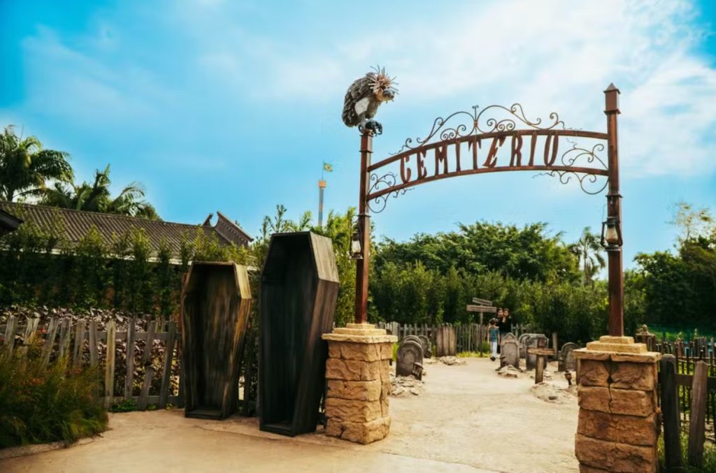 No local há caixões, lápides e cruzes, e se assemelha a uma atração de terror