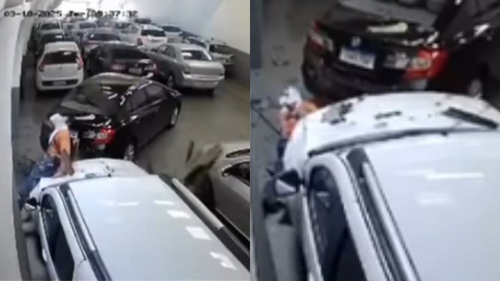 Imagens mostram que queda foi amortecida por carro que estava estacionado no momento