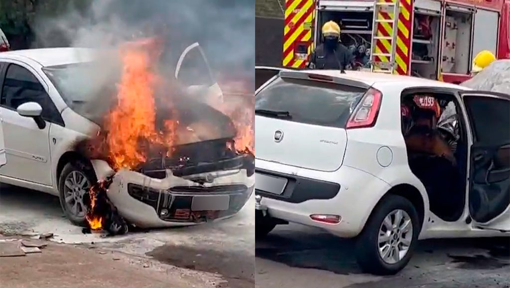 Vídeo: Carro é destruído pelas chamas em movimentada rua do bairro Jundiaí