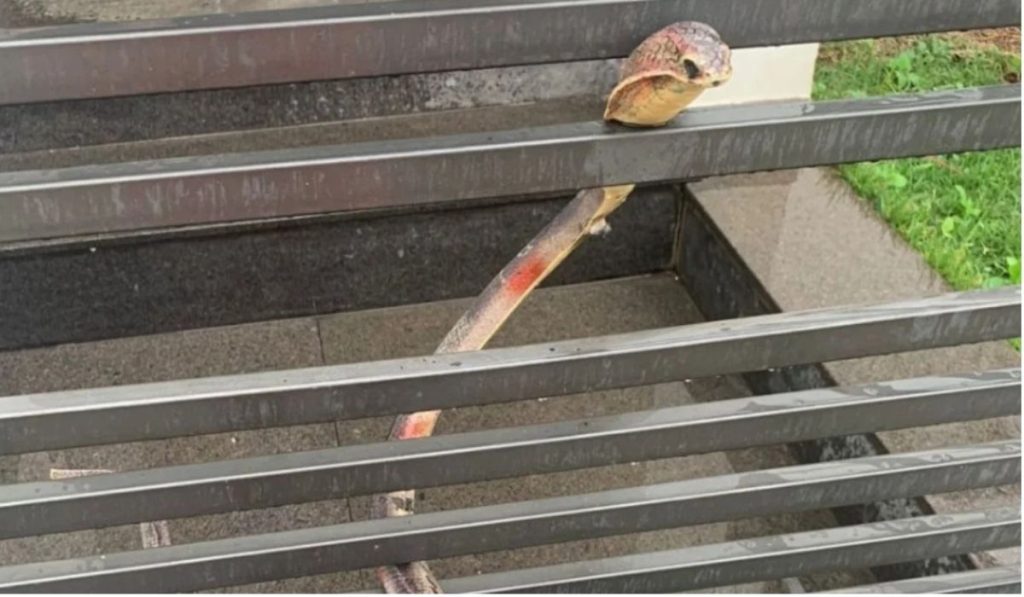 Serpente estava entrelaçada entre as grades do portão da residência e conseguiu amedrontar os moradores do local