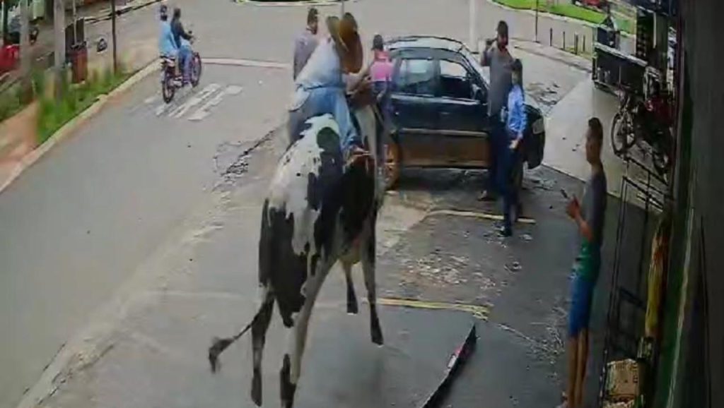 Boi descontrolado derruba homem, foge e danifica motocicletas no centro de Jaraguá; veja vídeo
