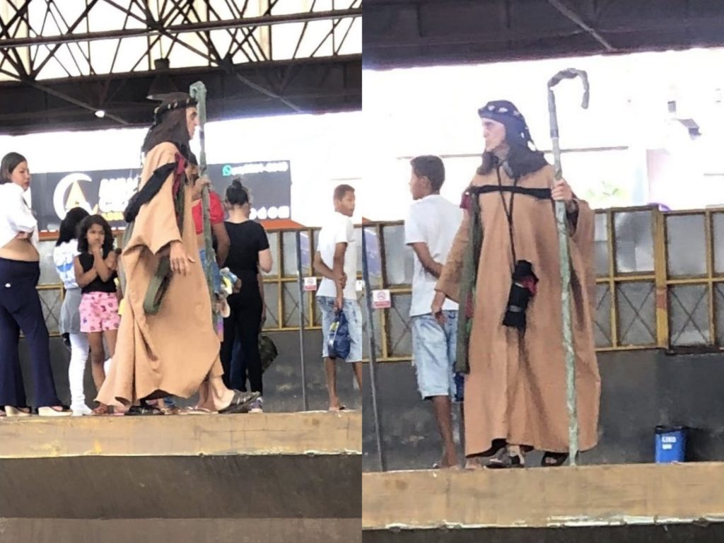 Homem vestido de Moisés para terminal da Praça da Bíblia, em Goiânia
