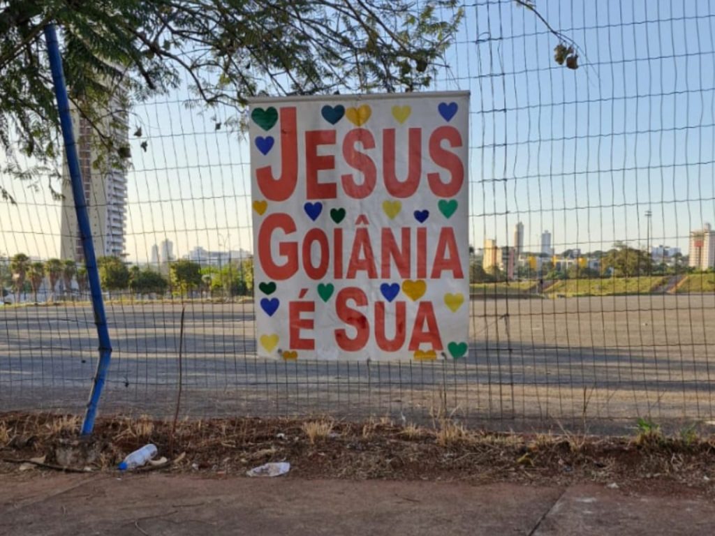 Aviso foi pendurado com bastante detalhes e letras garrafais, atraindo olhares de motoristas e fiéis
