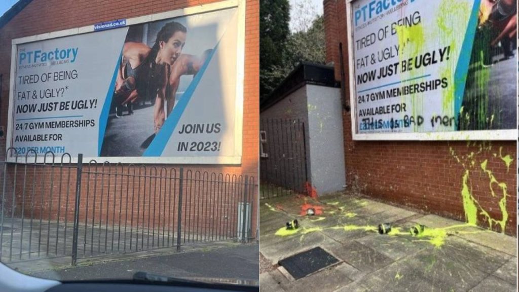 Populares jogaram tinta spray e escreveram "isso é ruim" por cima do anúncio original