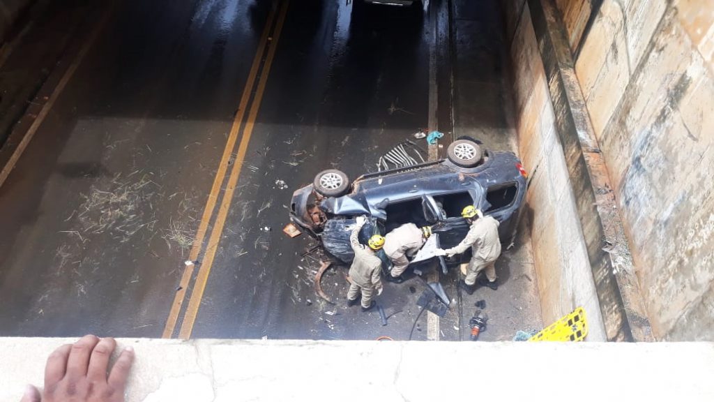 Carro cai de viaduto em Anápolis e bombeiros tentam tirar vítima das ferragens