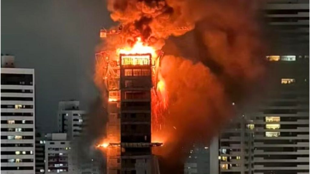 Imagens registradas por moradores do entorno, publicadas no X (antigo Twitter), mostram o imóvel em chamas e fragmentos da estrutura caindo da edificação