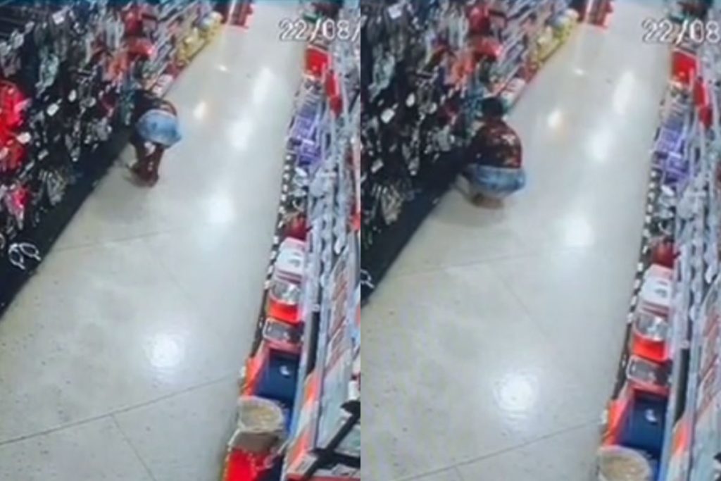 Câmeras de segurança filmaram momento em que suspeito coloca itens nas vestes e tenta sair sem pagar por eles