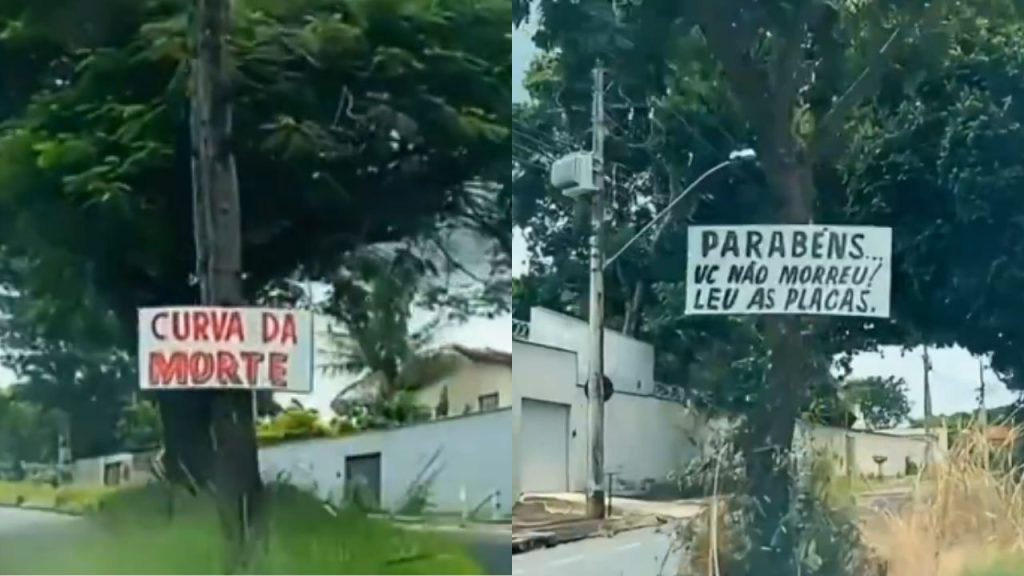 Ao longo do trajeto, ele vai citando cada um dos cartazes encontrados, afixados em árvores